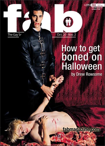 A few years ago Fab magazine, a gay scene magazine in Toronto, ran a vampire cover for Halloween. The vampire was decked out if this amazing leather coat from Northbound Leather (totally hot leather, btw). Sadly we don’t see him take the bite.